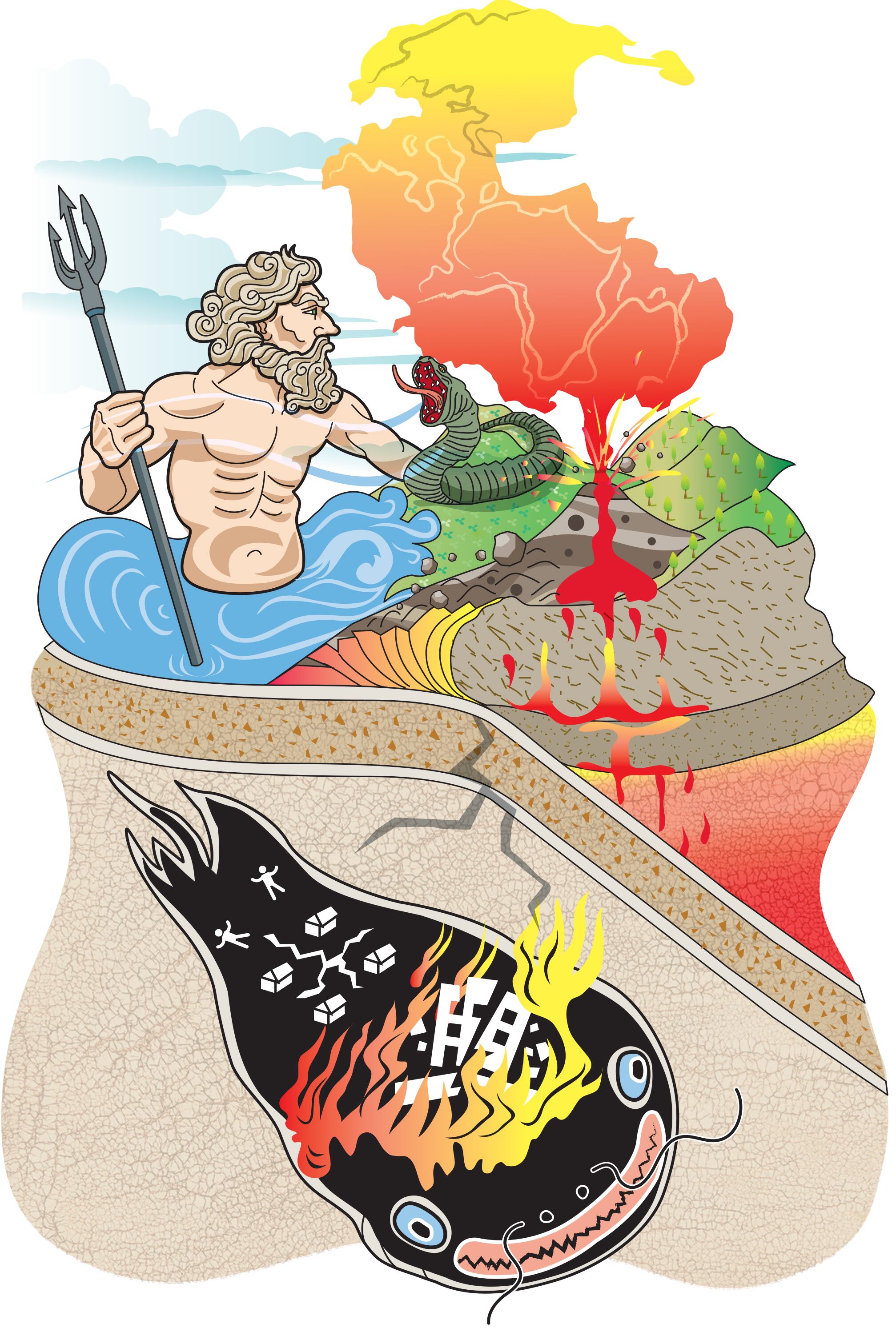 La mitología griega relata que el impulsivo Poseidón creaba sismos al picar la tierra con su trinche. Una leyenda de Guanacaste cuenta que en la cumbre de Cerro de las Cruces habita una enorme serpiente, cuyos movimientos causan los temblores de Nicoya.