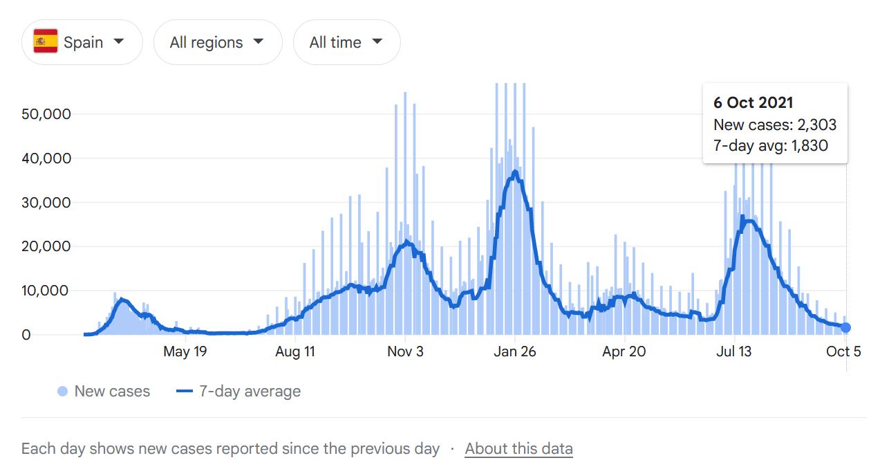 Regresando a Chile y España, a comienzos de octubre la vida va mejor. A pesar de que la inmunidad colectiva no puede ser declarada, el que haya más del 70% de los habitantes totalmente vacunados ha traído un levantamiento de las medidas restrictivas.