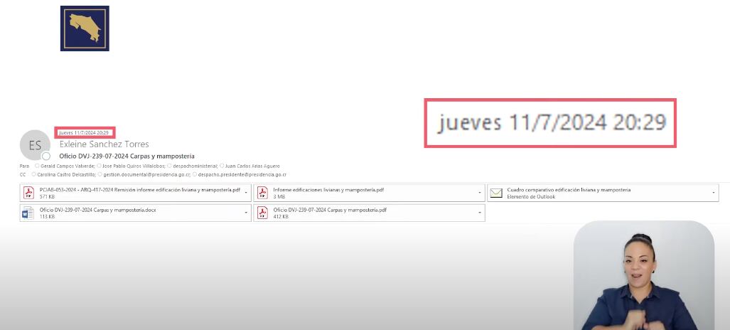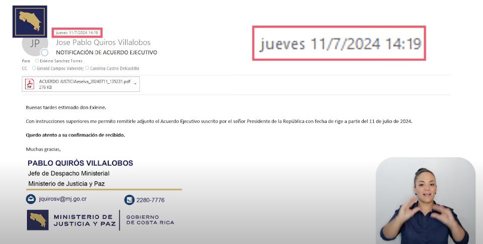 De acuerdo con la captura, a Sánchez se le notificó el jueves 11 de julio a las 2:19 p. m. sobre su destitución, según instrucciones de “superiores” y con un adjunto del Acuerdo Ejecutivo suscrito por el presidente de la República. Sánchez respondió con el recibido del correo a las 2:49 p. m. del mismo día. Sin embargo, a pesar de que el video proyecta esta imagen, no queda claro que la separación del cargo del exviceministro tiene como fundamento el presunto acoso laboral. Además, este motivo de despido es contradictorio con el mensaje de destitución divulgado el jueves por la Casa Presidencial, en el cual Rodrigo Chaves más bien agradeció a Sánchez por su “su labor y compromiso”.