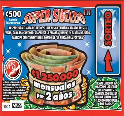 La Junta de Protección Social (JPS), lanzó dos juegos de lotería instantánea (raspaditas) con los cuales los ganadores podrían recibir un salario mensual de ¢1.250.000 o ¢2,5 millones durante dos años.