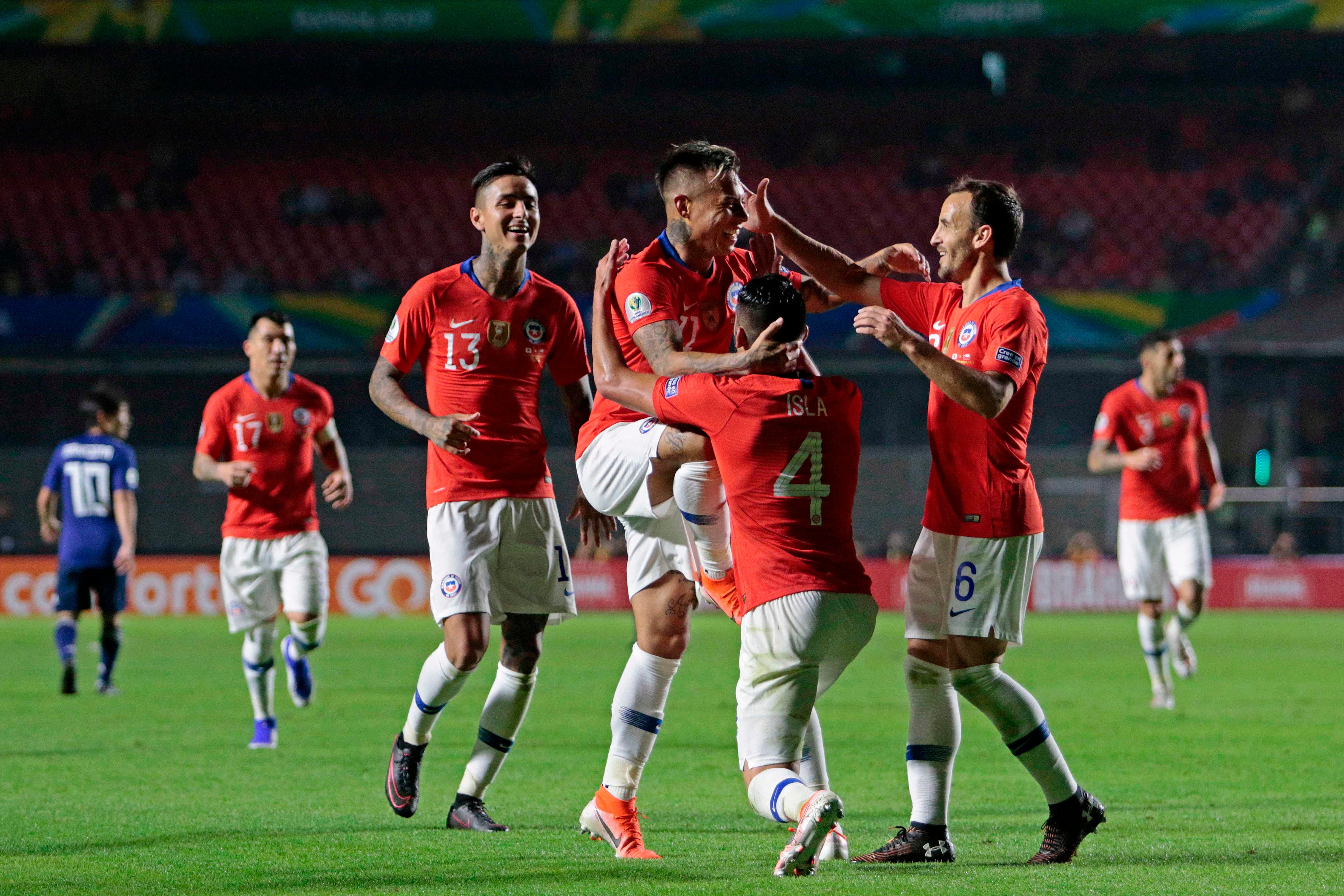 Los jugadores de Chile celebran uno de los cuatro goles ante Japón en la Copa América. Foto: AFP (MIGUEL SCHINCARIOL/AFP)