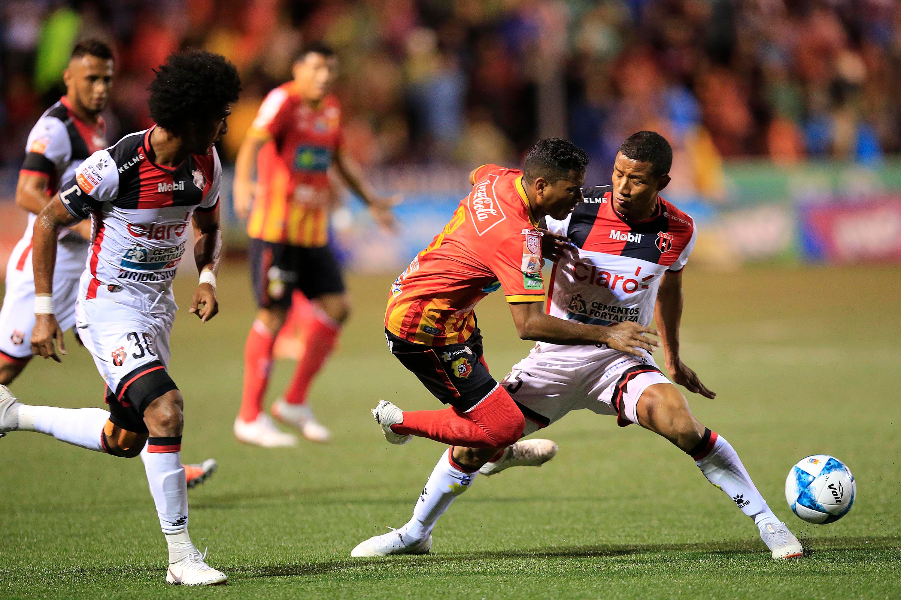 El florense Allan Cruz intenta quitarse la marca de Luis Garrido, de Alajuelense. Fotografía: Rafael Pacheco (Rafael PACHECO GRANADOS)