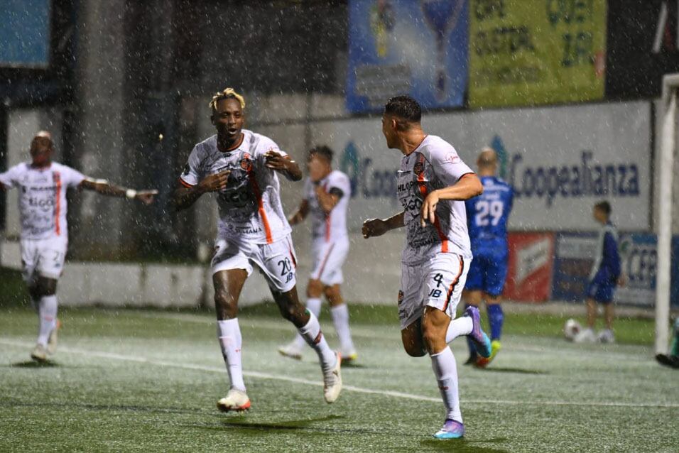 Steven Williams (izquierda) y William Fernández celebran la primera anotación del Puntarenas FC ante el Pérez Zeledón. (Rolando Áviles de FaroPuntarenas)