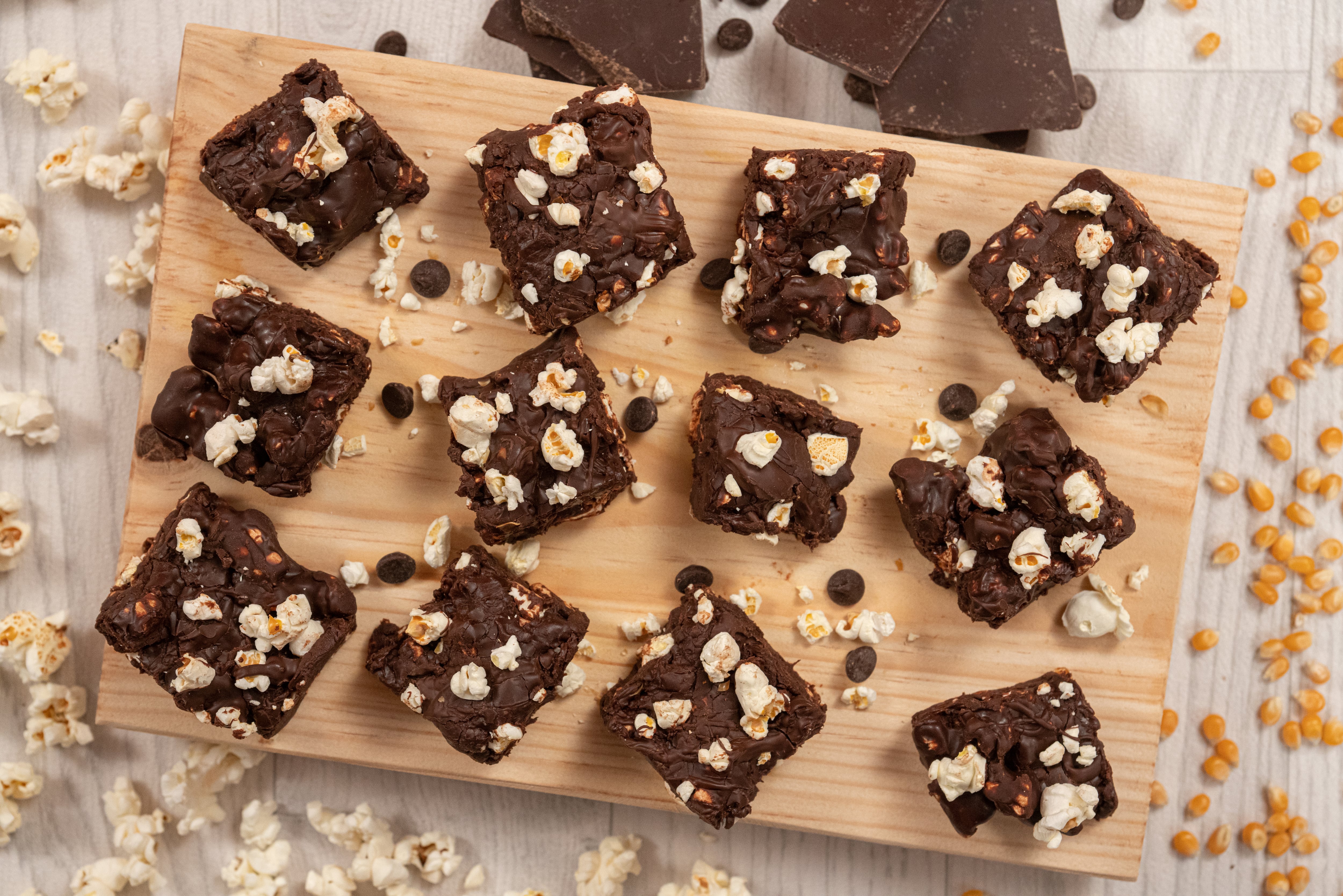 - 5. Trocee las palomitas de maíz reservadas y distribúyalas sobre las mezcla anterior. Vuelva a esparcir más chocolate derretido. Refrigere