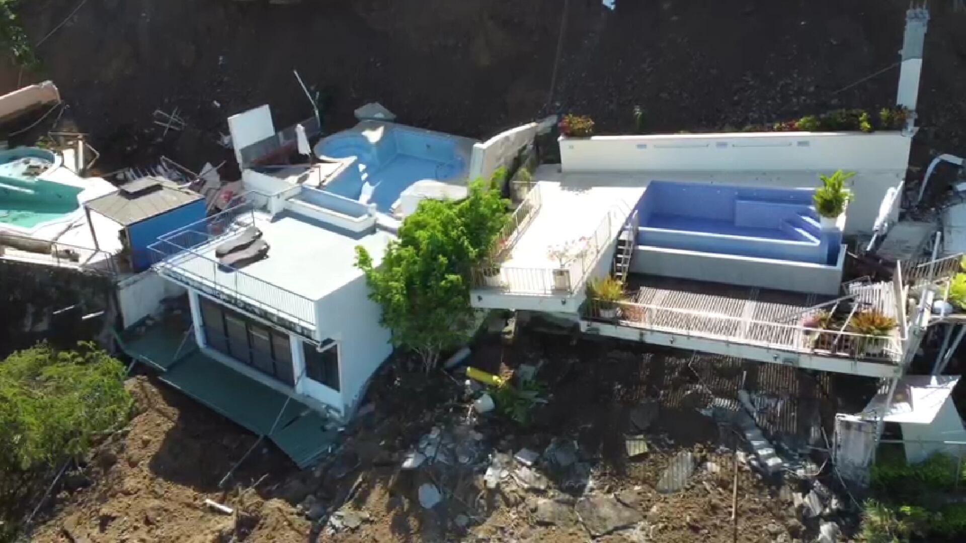 Imágenes del derrumbe permiten ver, entre los restos, tres piscinas privadas que tenían algunas de las casas. Incluso, otra alberca quedó en el aire con las varillas expuestas, junto a una vivienda falseada y en riesgo de caer. También se observan sombrillas de sol que tenían sus propietarios en las terrazas.