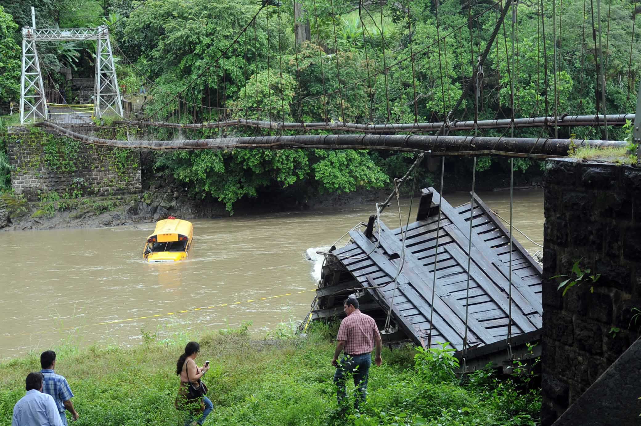Al cruzar el puente de hamaca sobre el río Grande de Tárcoles, este colapsó.