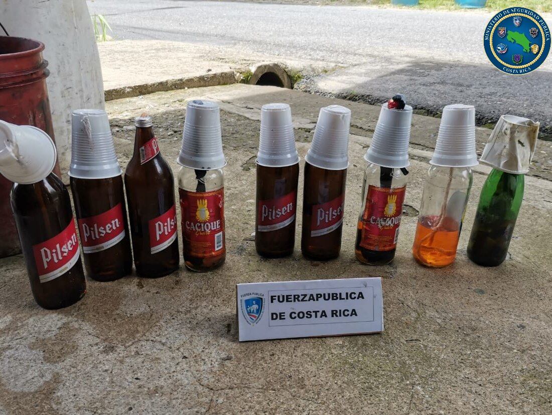 En la Irma de Las Juntas, en Abangares, Guanacaste, se descubrió el uso de una bomba molotov fabricada con una botella de vidrio, que contenía gasolina y ácido.