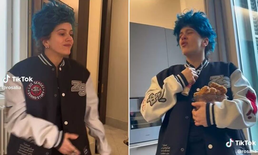 Rosalía encantó con la parodia que realizó de su prometido Rauw Alejandro en TikTok, donde los usuarios ya esperan la revancha del puertorriqueño. Con una peluca despeinada en azul vibrante, lentes negros y una chaqueta azul con blanco, la cantante española imitó a su prometido al hablar por teléfono, dormir y bailar.