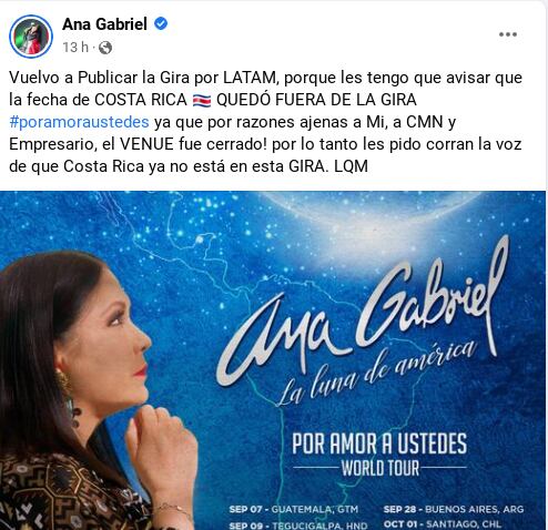 La cantante mexicana Ana Gabriel anunció en sus redes sociales que el concierto que ofrecería en Costa Rica, como parte de su gira por Latinoamérica, quedó cancelado.